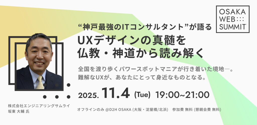 株式会社エンジニアリングサムライ 代表取締役 坂東 大輔 氏をお招きし、難解なUXの真髄を仏教・神道というアプローチから読み解きます。